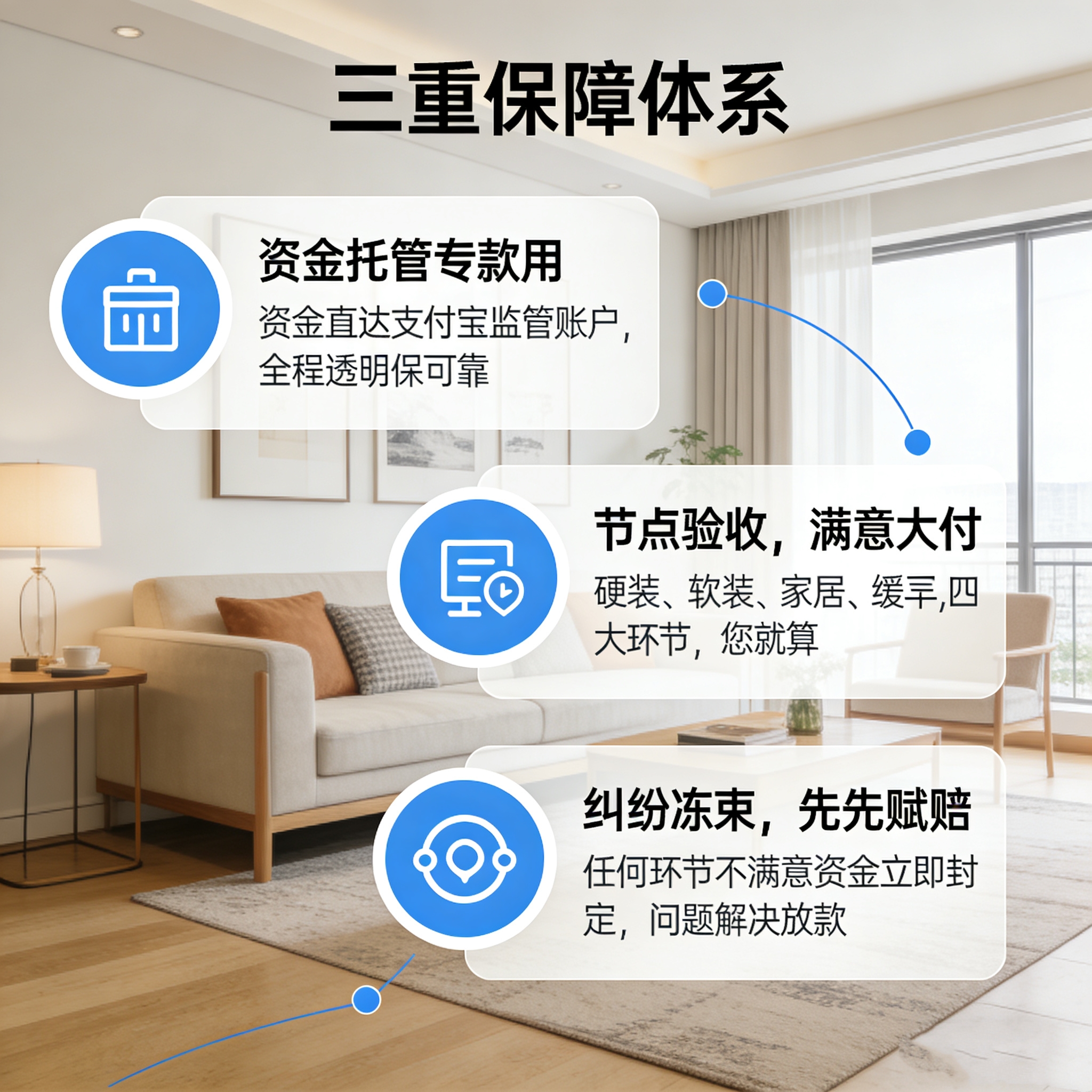 專款專用,物理隔離:您的錢,始終在您名下的支付寶賬戶中,與裝飾公司的運營資金完全隔離。從根本上杜絕了“資金被挪用”的風險。